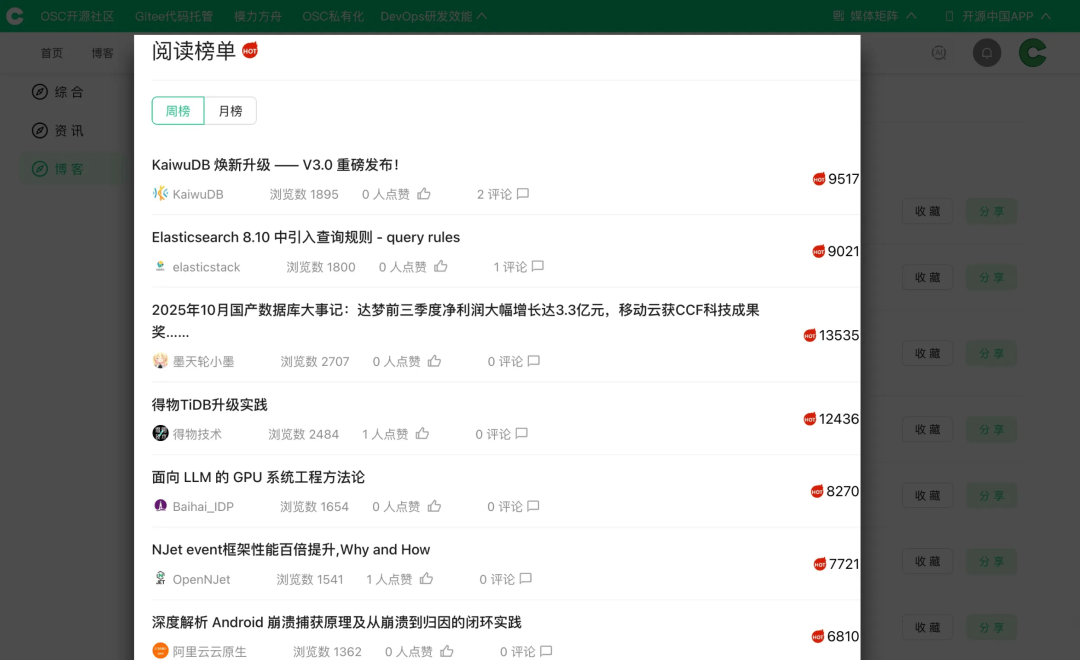 「动弹」是 OSCHINA 旗下专为开辟者和手艺从业者打制的专业互动平台,「周榜」取「月榜」两个维度,