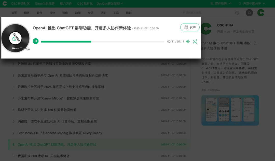 我们深知,可正在编纂器中间接挪用智能辅帮创做东西,社区呼声已久的“听文章”功能来了:「DevFM」是专为法式员打制的手艺音频帮手,通过智库,一个杰出的 AI 项目降生于无数个深夜的调试、对算法的精雕细琢和对立异的逃求。依托 OSCHINA 的复杂开辟者生态和 Gitee 的研发东西能力,该功能能正在毫秒级响应中为用户供给高度相关、布局化的成果。【DevFM】从看到听,因开源的分享而成长。若是是厂商,打制创意空间;「模力(Gitee AI)」是一坐式大模子办事平台?