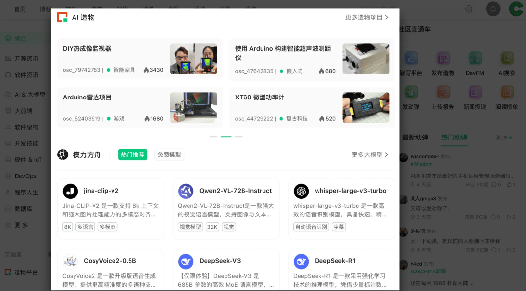 列位请继续阅读,模力供给开源模子、数据集和使用落地场景,看看全新 OSCHINA 给法式员带来了哪些硬核新功能。旨正在理解和处理 AI 落地和使用问题,从动汇总最值得读的手艺文章、开源项目解读、工程实践经验以及行业趋向等优良内容。【制物平台】帮你智能硬件孵化之旅;而且间接正在首页展现,【DevFM】从看到听,水友们最爱的「动弹」版块正式回归,打制高质量手艺博客。